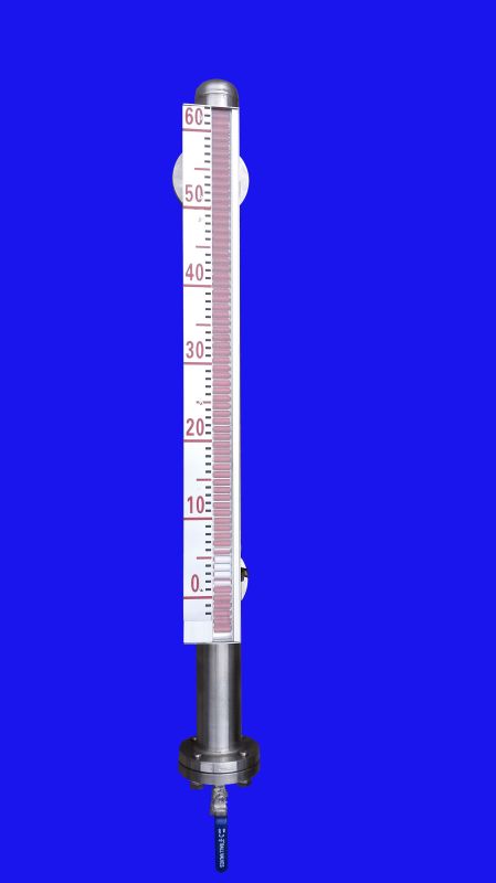磁性液位計是根據(jù)浮力原理(阿基米德定律)結合磁性耦合作用研制而成,當被測量容器中的液位升降時,液位計主導管內(nèi)的浮子也隨之升降,浮子內(nèi)的永久磁鋼通過磁耦合作用傳遞到現(xiàn)場指示器(刻度尺),驅動紅、白磁柱轉動。當液位上升時,磁柱由白色轉為紅色,當液位下降時,磁柱由紅色轉為白色,指示器的紅、白交界處即為容器內(nèi)介質(zhì)液位的實際高度。