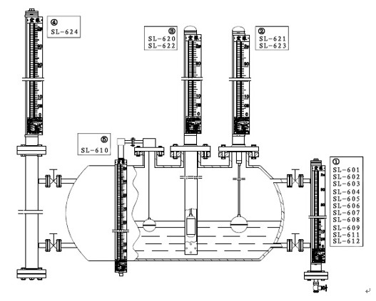 - 旁通頂裝式:SL-624 型旁通頂裝式液位計適用于低位槽罐,但為觀察方便需提高觀察方位的設備的液位測量。