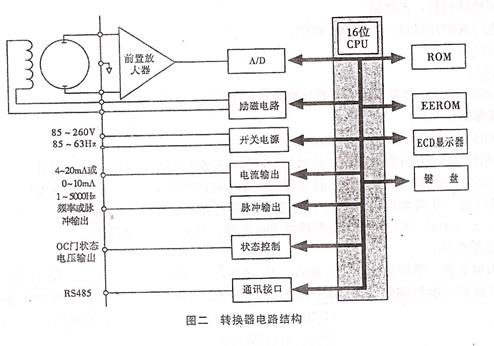 電磁流量轉(zhuǎn)換器一方面向電磁流量傳感器勵(lì)磁線(xiàn)圈提供穩(wěn)定的勵(lì)磁電流,以達(dá)到B是一個(gè)常數(shù),同時(shí)把傳感器感應(yīng)的電動(dòng)勢(shì)放大轉(zhuǎn)換成標(biāo)準(zhǔn)的電流信號(hào)或頻率信號(hào),便于流量的顯示,控制與調(diào)節(jié).圖二所示為轉(zhuǎn)換器電路結(jié)構(gòu)。