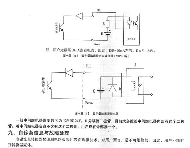 報(bào)警輸出:兩路帶光電隔離的晶體管集電極開(kāi)路報(bào)警輸出。外接電源不大于35V,導(dǎo)通時(shí)集電極最大電流為250mA。報(bào)警狀態(tài):流體空管、勵(lì)磁斷線(xiàn)、流量超限。